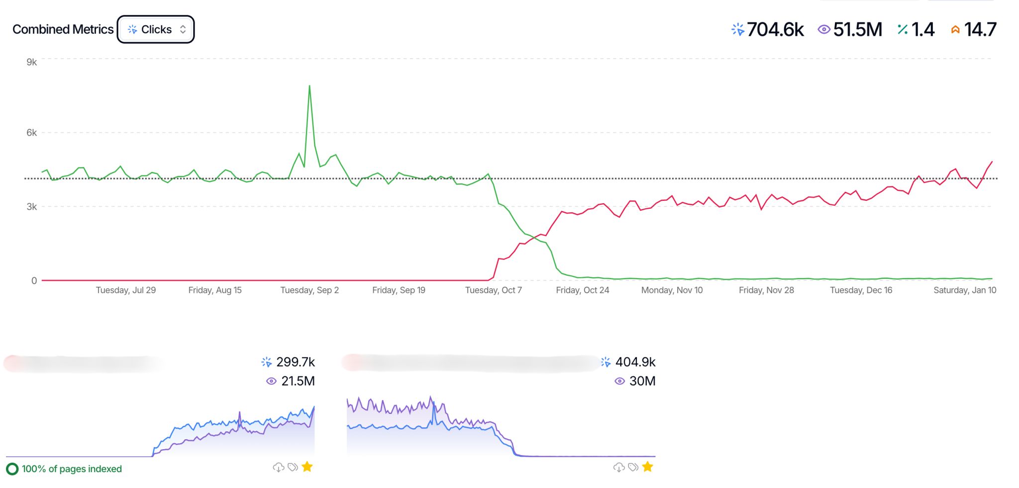 We started planning for the migration in early summer of 2025. The migration launched on October 7, 2025. By January 1, 2026 organic keywords and traffic had fully recovered to pre-migration baselines.